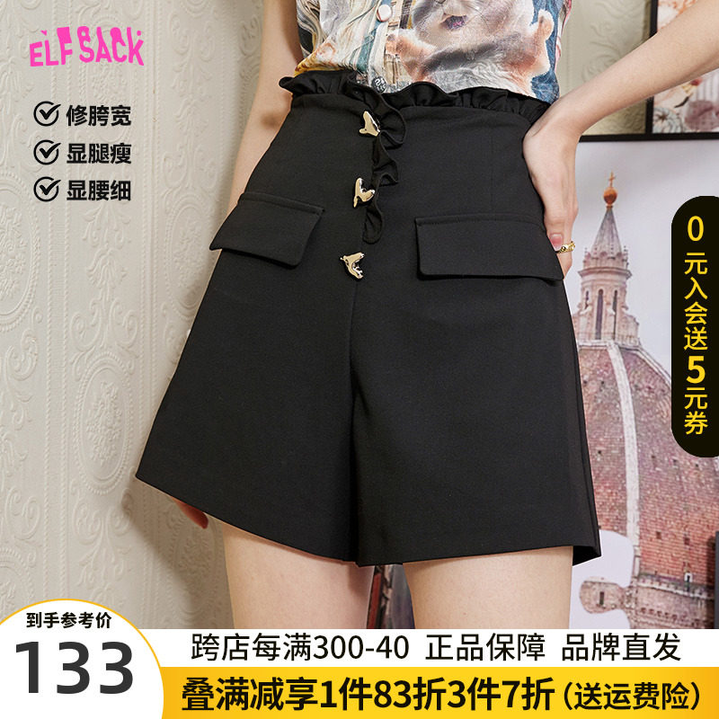 妖精的口袋荷叶边高腰黑色短裤女2023夏季新款休闲西装裤显瘦裤子