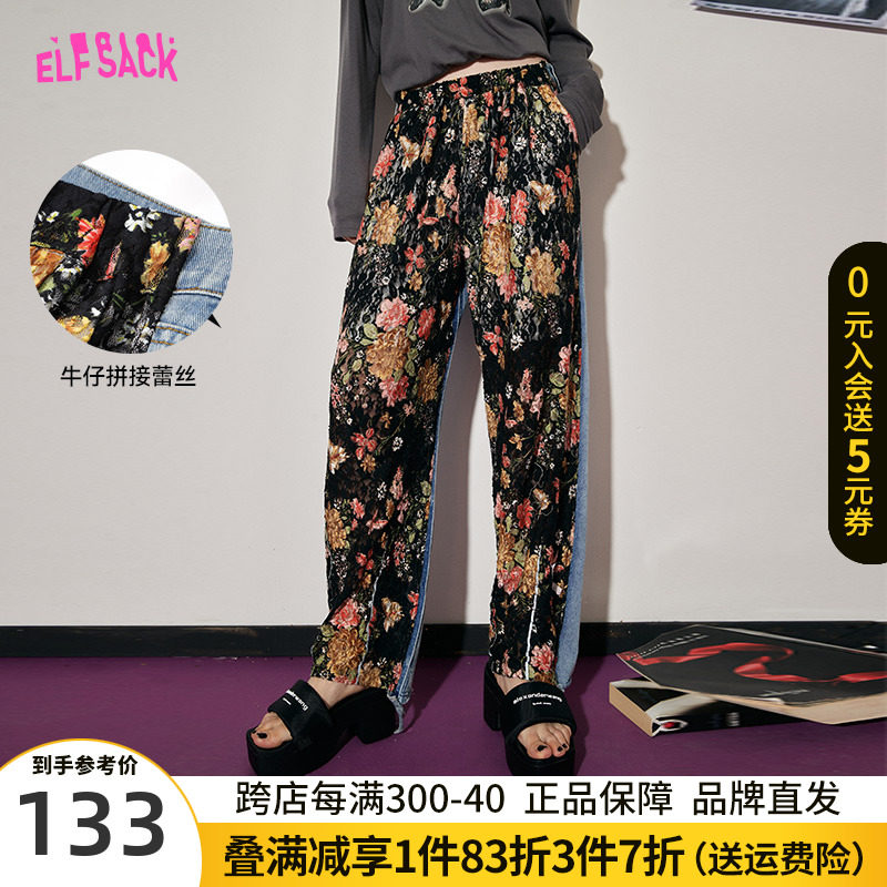 商场同款妖精的口袋拼接蕾丝阔腿牛仔裤女2023春秋季新款直筒裤子