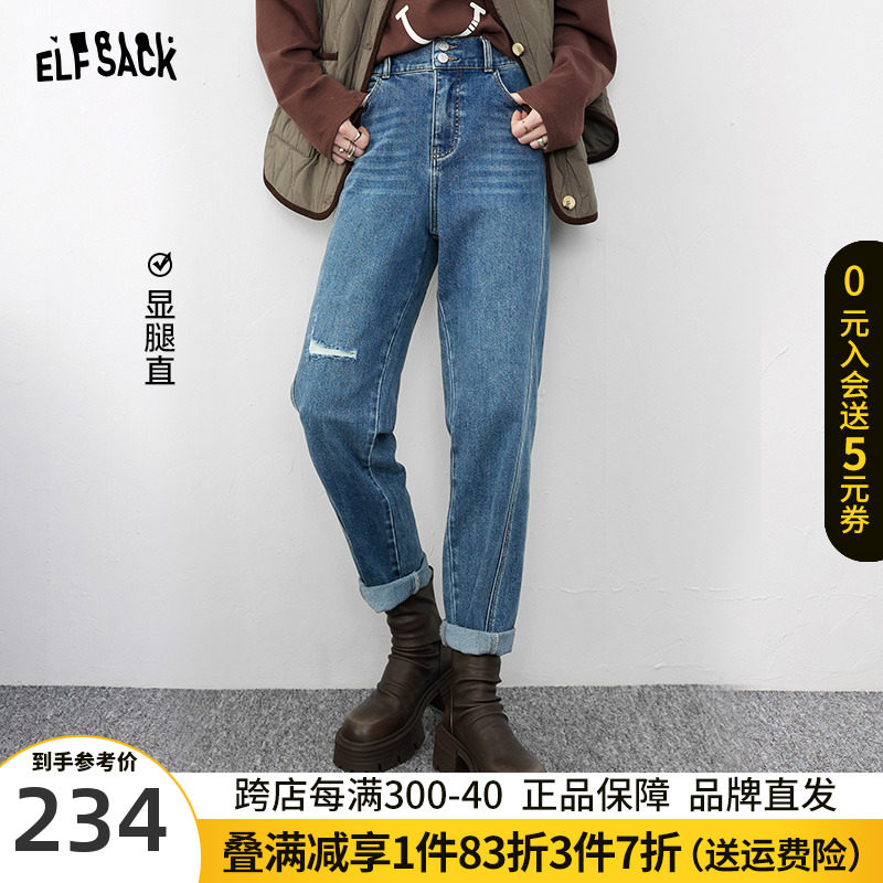 妖精的口袋水洗直筒牛仔裤女2023秋季新款小个子深色宽松显瘦裤子