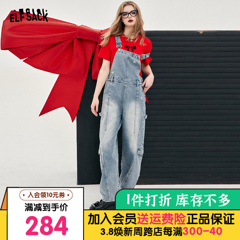 妖精的口袋星星刺绣浅色牛仔背带裤女2024年早春新款宽松阔腿裤子