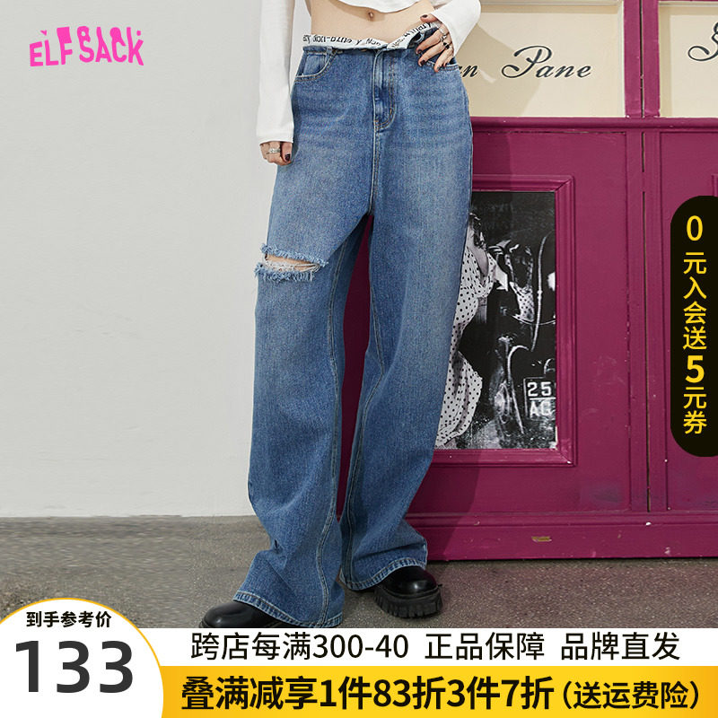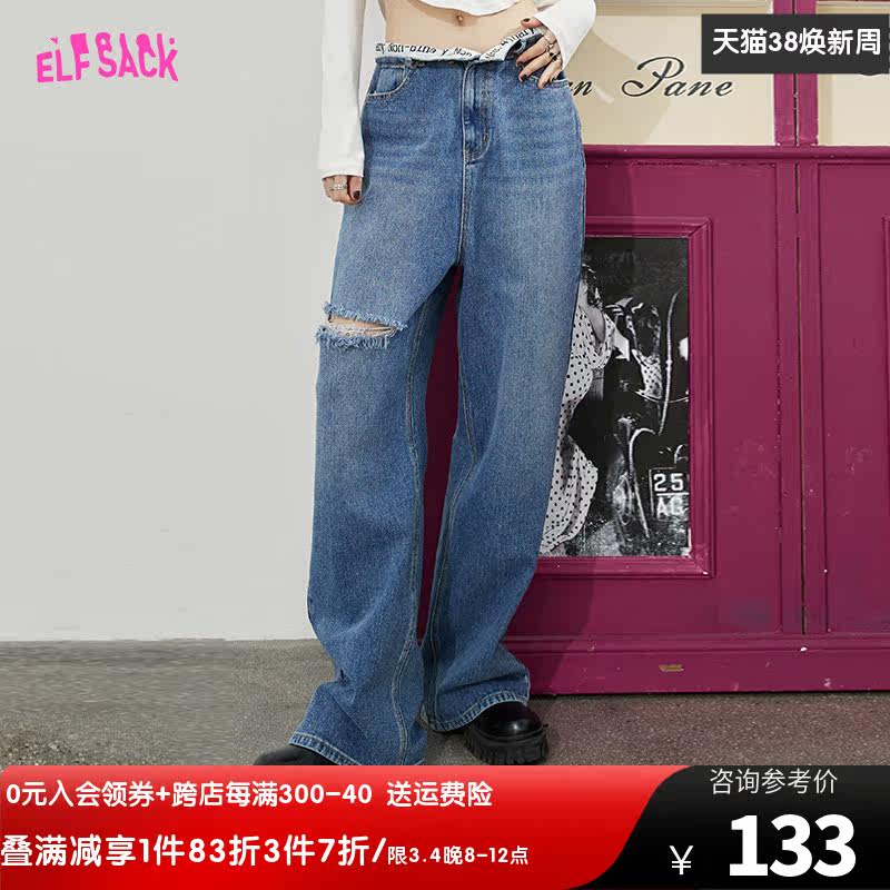 妖精的口袋破洞牛仔裤女2024春季新款直筒裤宽松阔腿设计感长裤子