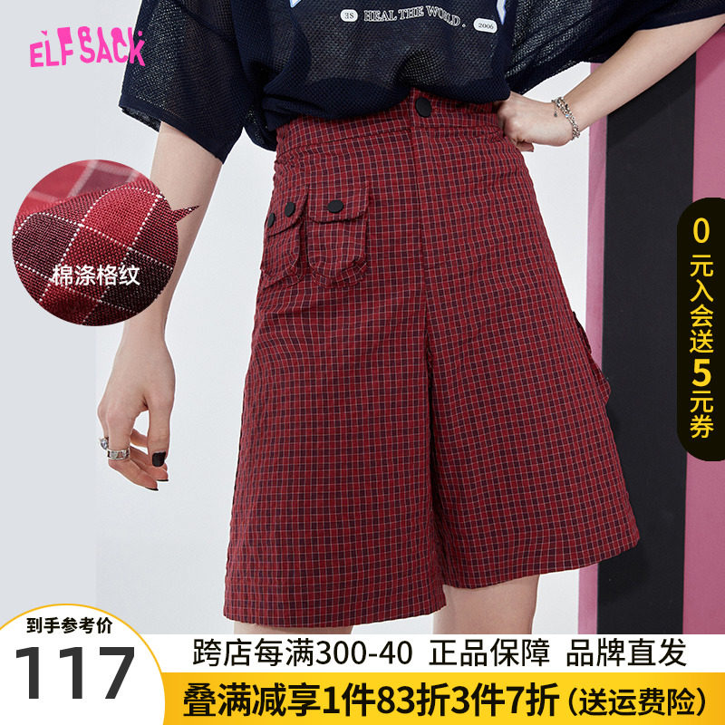 妖精的口袋红色格子短裤女2023夏季新款宽松阔腿直筒显瘦休闲裤子