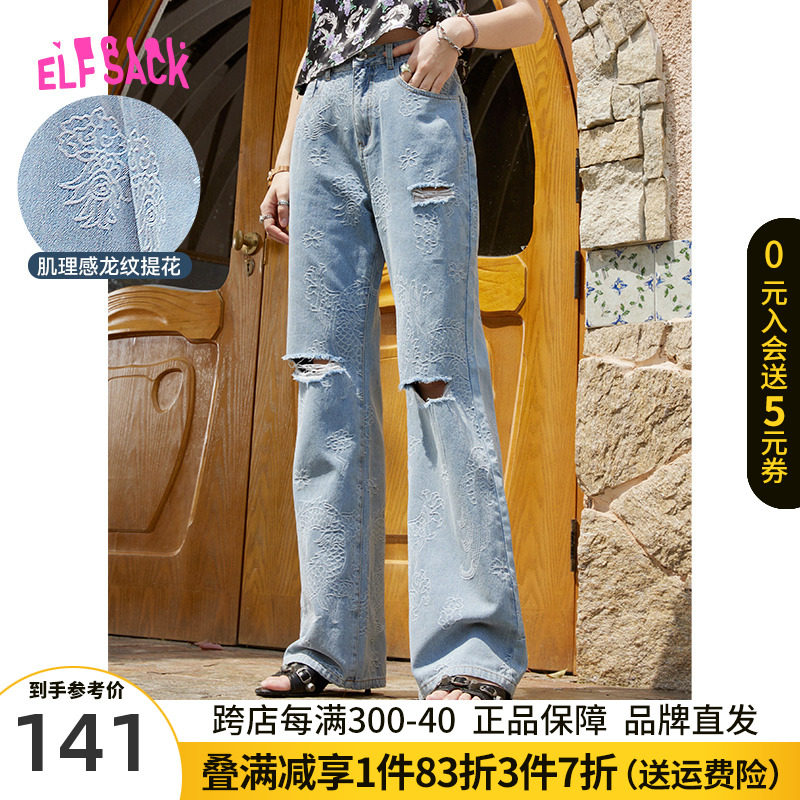 妖精的口袋龙纹破洞牛仔裤女2023夏季新款设计感复古显瘦微喇裤子