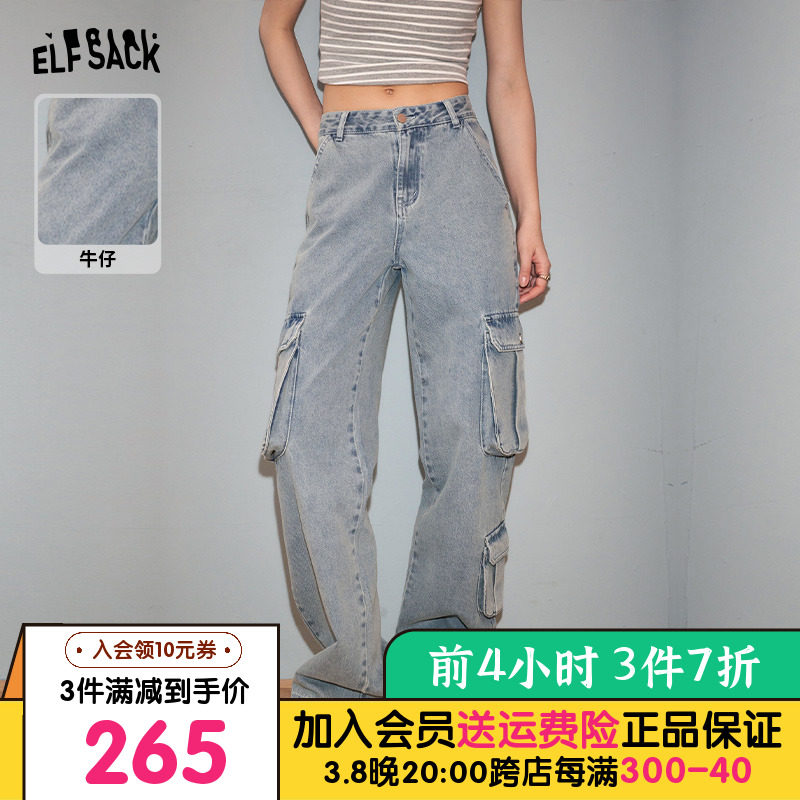 妖精的口袋工装风浅色阔腿牛仔裤女2024春新款高腰小个子宽松裤子