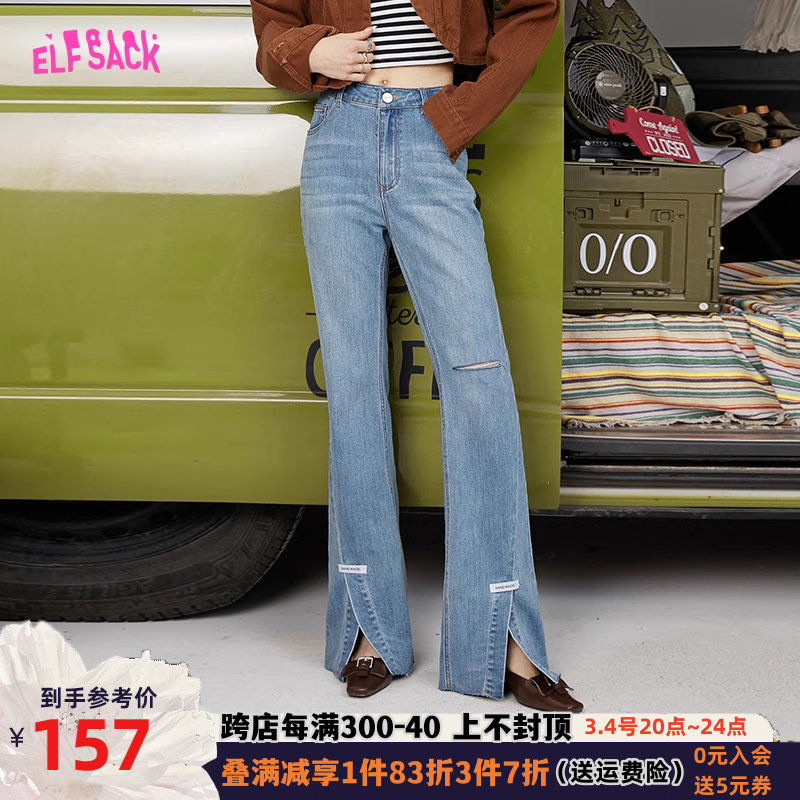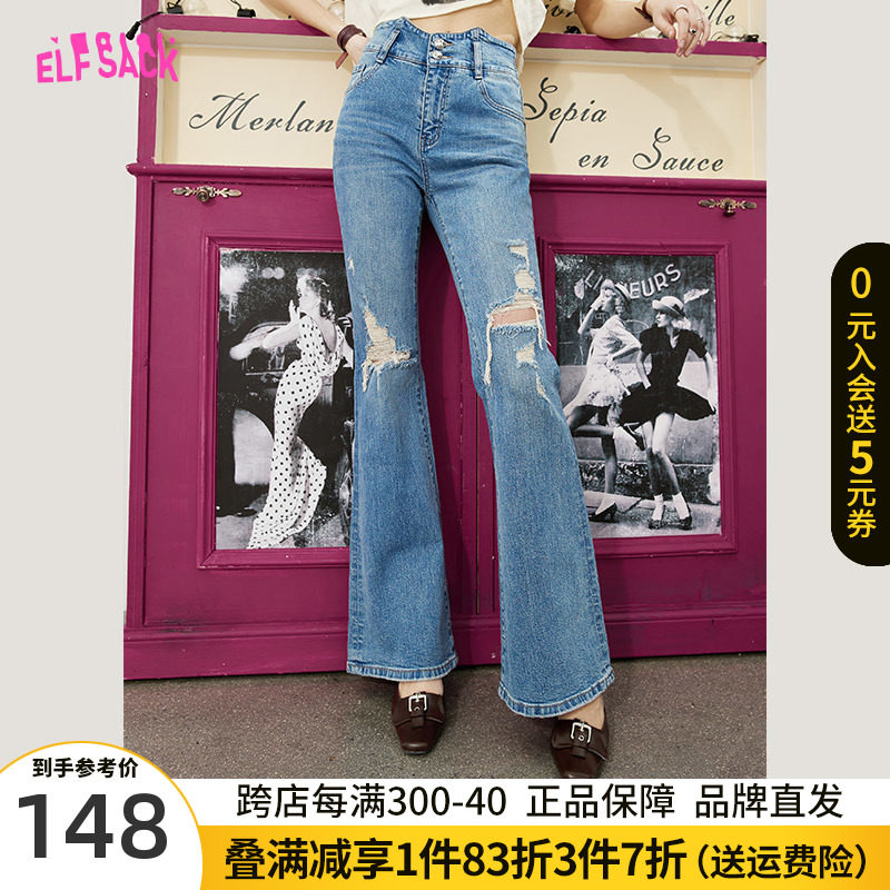 妖精的口袋浅色开叉喇叭裤女2023春秋新款破洞牛仔裤高腰显瘦裤子