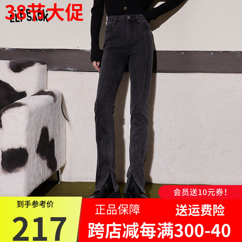 妖精的口袋高腰直筒牛仔裤女2023冬季新款灰色修身显瘦开叉裤子潮