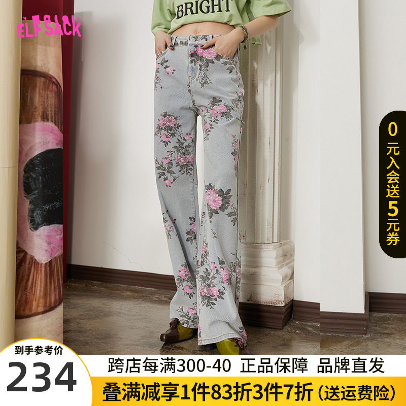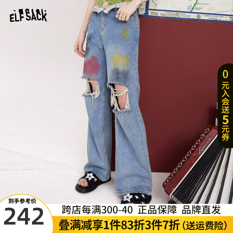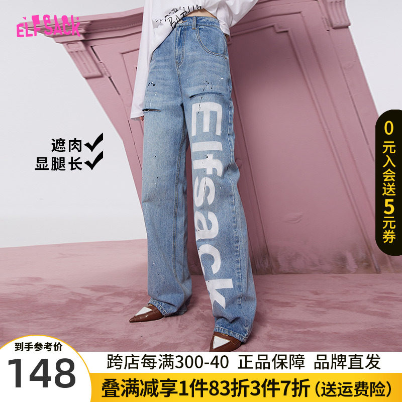 妖精的口袋满印直筒牛仔裤女2023春秋新款破洞宽松设计感小众裤子