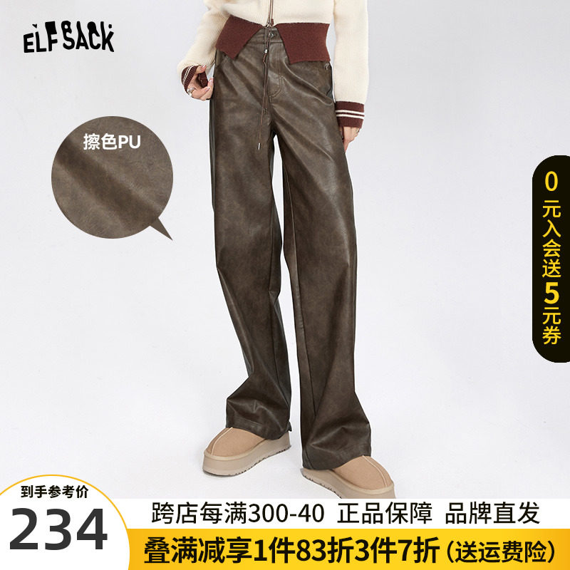 妖精的口袋美式复古皮裤女2024春季新款美拉德宽松休闲直筒裤子潮