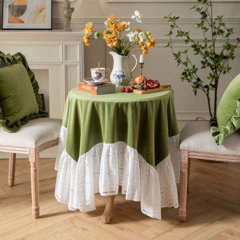 法式轻奢桌布圆桌盖布褶皱荷叶边高级感牛油果色丝绒餐桌茶几台布
