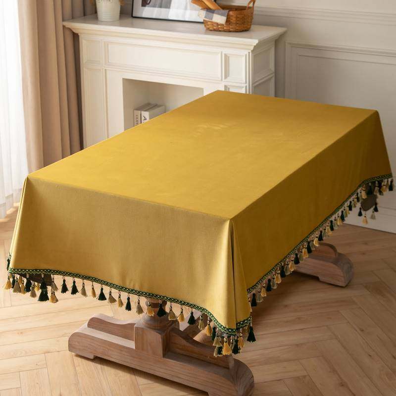 绿色丝绒长方形家用餐桌布艺丝绒金须轻奢高级感圆形台布美式