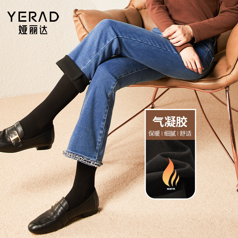 娅丽达厚绒女裤保暖微喇牛仔裤女高弹裤子2022秋冬新款九分喇叭裤