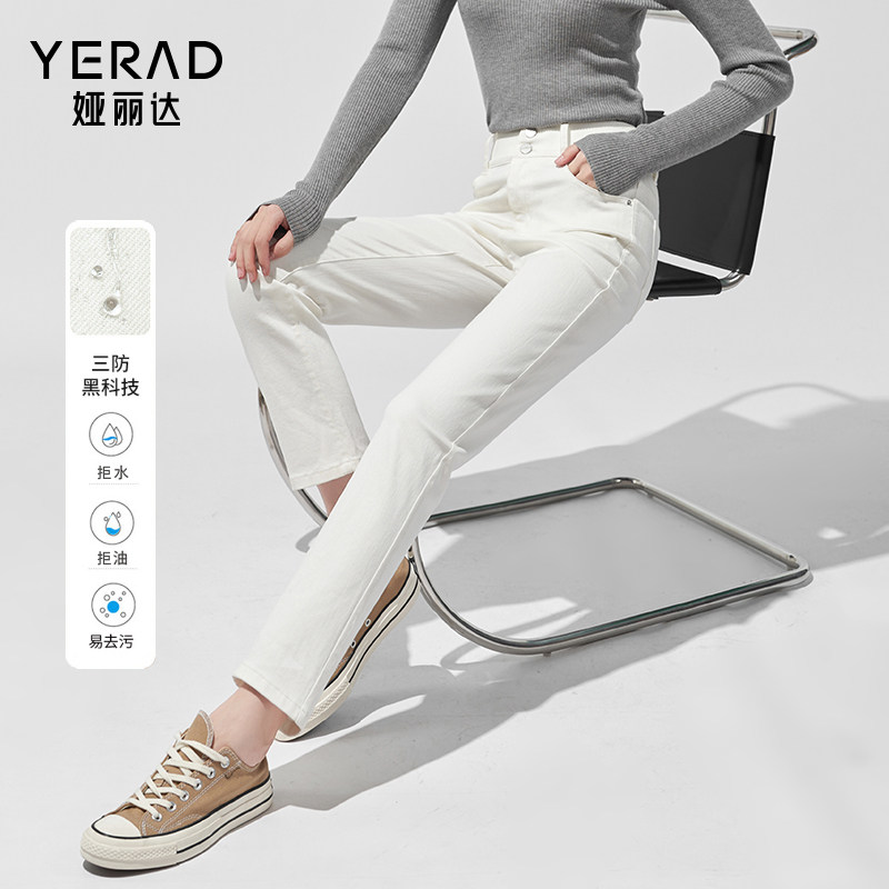 娅丽达白色三防牛仔裤女2023秋新款裤子九分直筒裤驼色小个子女裤