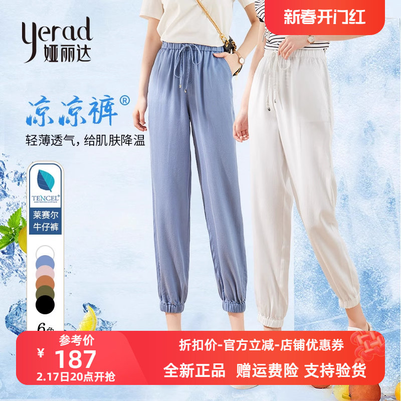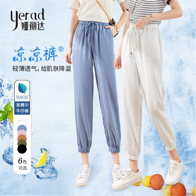 娅丽达莱赛尔天丝高腰束脚工装裤女军绿色裤子2021夏季薄款九分裤