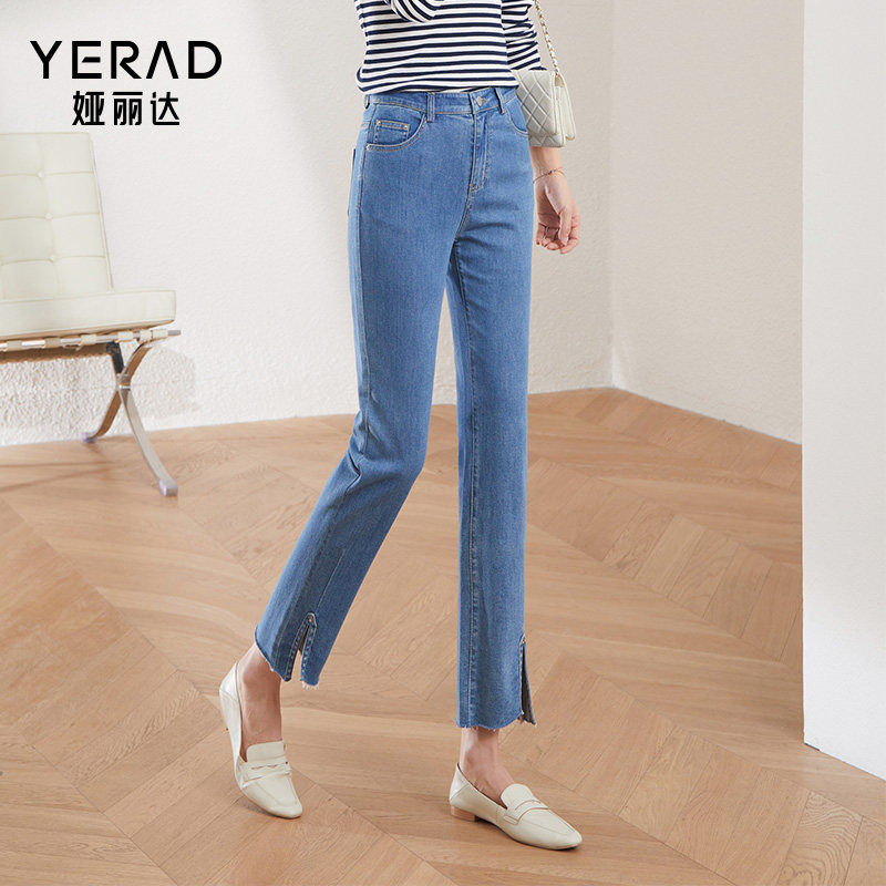 2023秋季新款简约基本款直筒牛仔裤娅丽达时尚显瘦开叉九分锥形裤