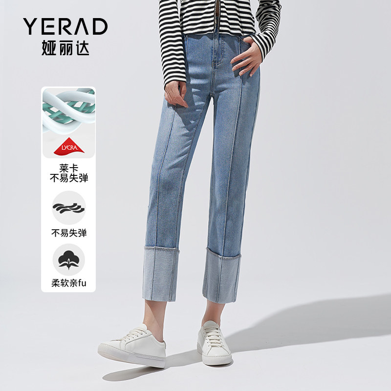 娅丽达莱卡弹力九分裤宽松直筒牛仔裤女2023秋装新品挺括卷边裤子