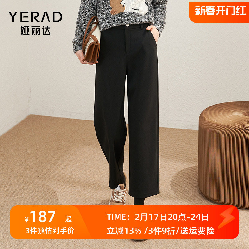娅丽达女裤加厚阔腿裤女2023冬季休闲裤黑色西装裤子九分裤直筒裤