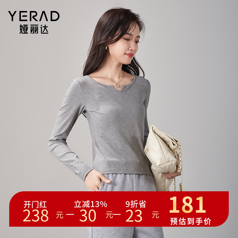 娅丽达设计感v领休闲打底t恤女长袖2024春季新款修身显瘦内搭上衣