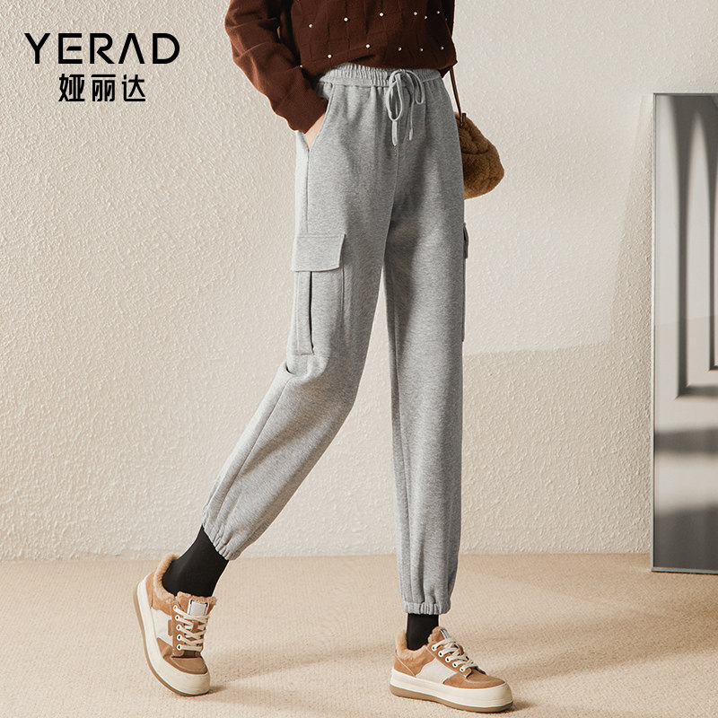 娅丽达女裤加绒运动裤女工装裤秋冬大码卫裤灰色束脚休闲裤子