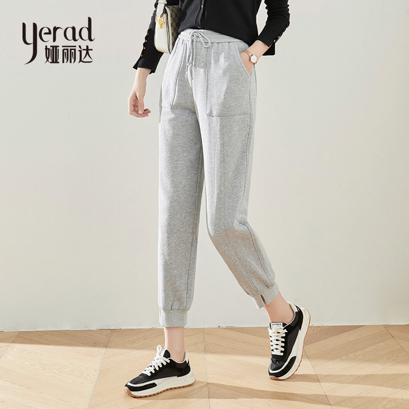娅丽达女裤灰色运动裤女九分裤2022秋季新款休闲裤子高腰束脚卫裤