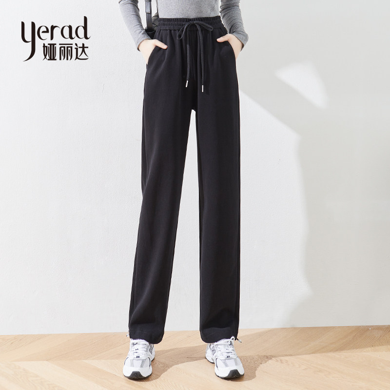 娅丽达女裤加绒阔腿裤女2023新款冬季季拖地裤子黑色休闲裤直筒裤