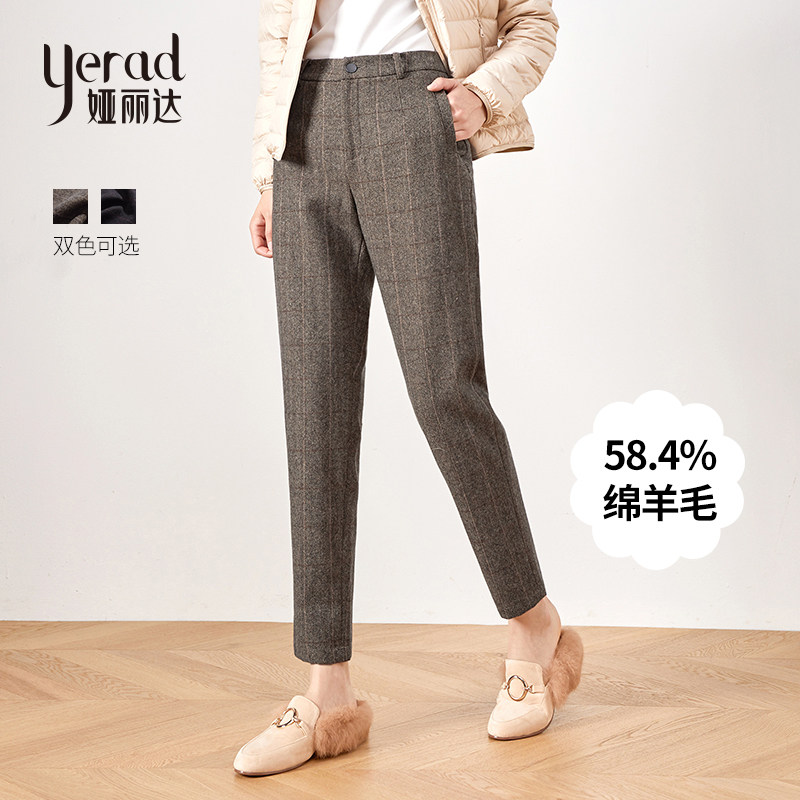 正品娅丽达冬季女装休闲通勤松紧腰人字纹羊毛呢格子西装裤I4613