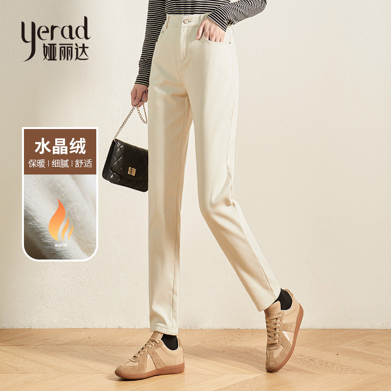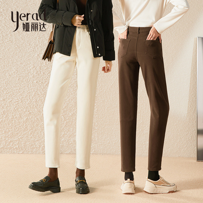娅丽达女裤加绒牛仔裤女2022秋冬新款裤子加厚白色显瘦大码哈伦裤