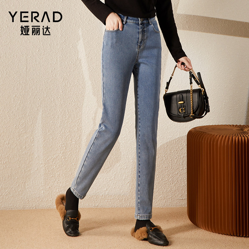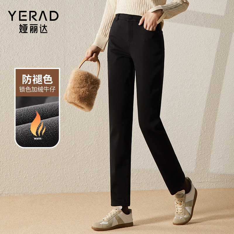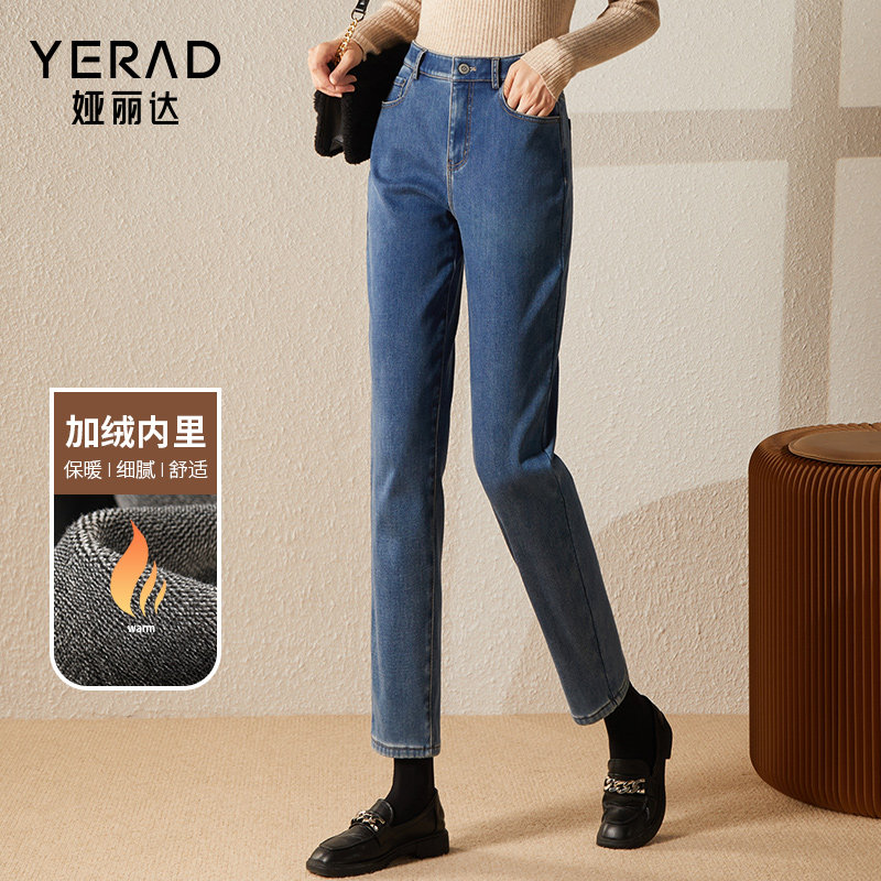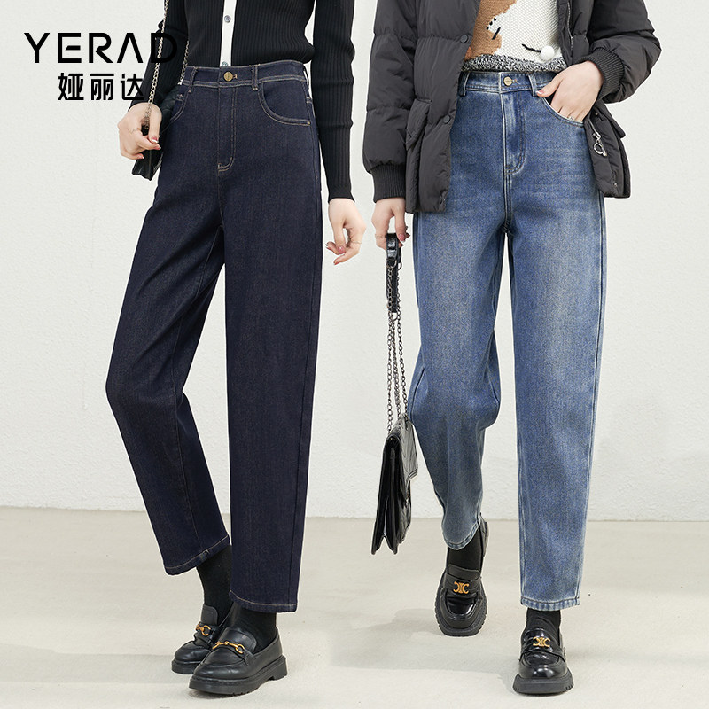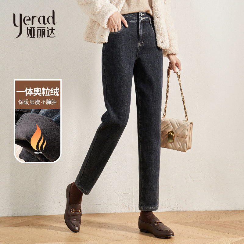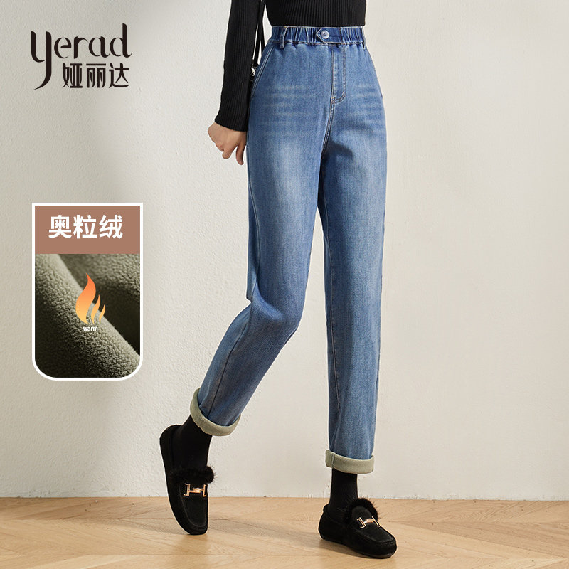 娅丽达加绒哈伦牛仔裤女加厚宽松女裤2022冬季新款修身显瘦老爹裤