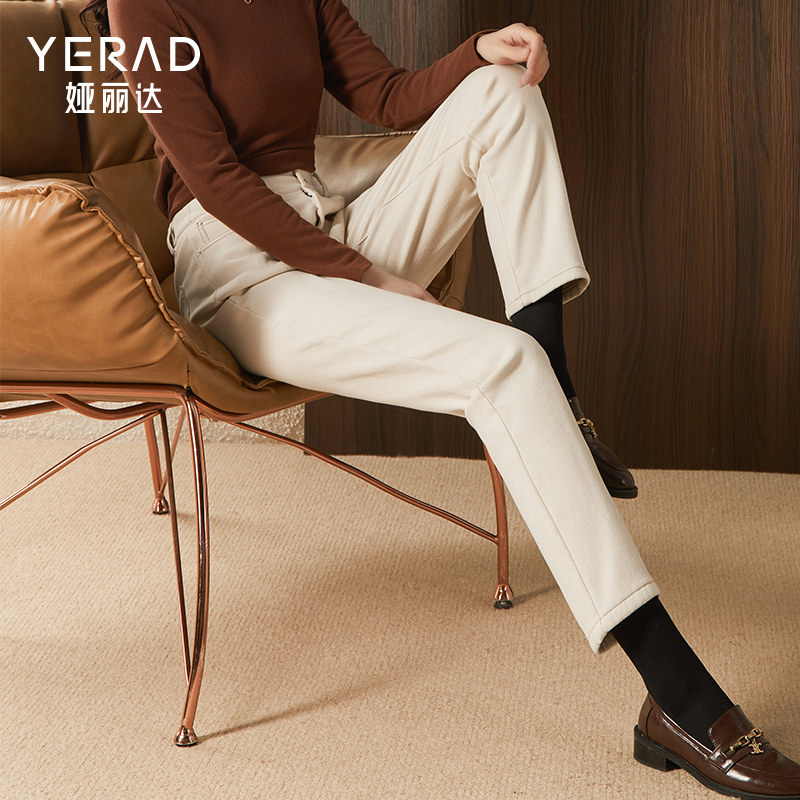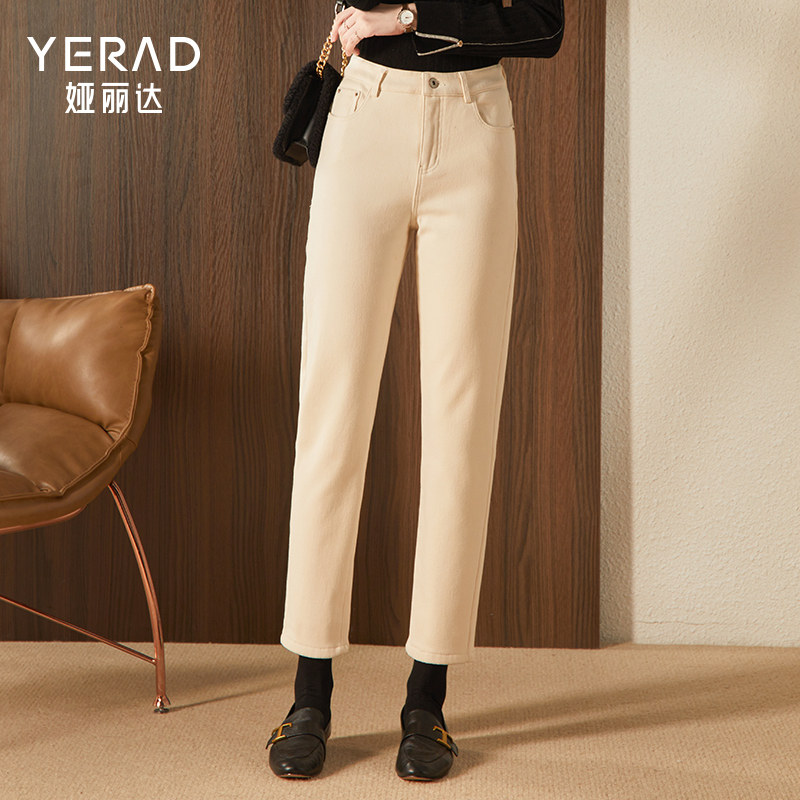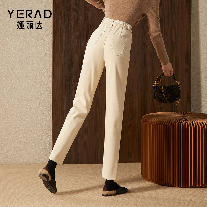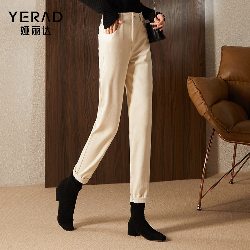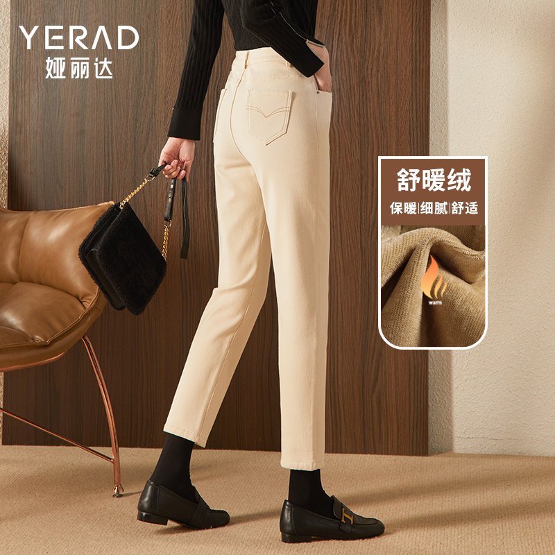 娅丽达通勤保暖加绒牛仔裤女秋冬季宽松知性气质米白色高腰哈伦裤