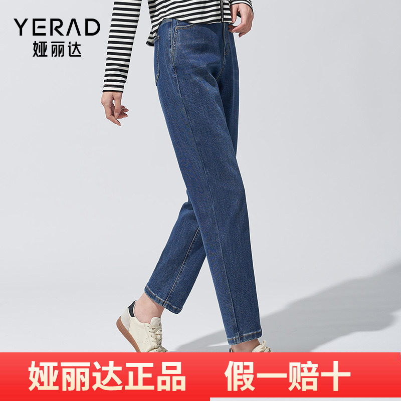 娅丽达加绒高腰牛仔裤女2021秋冬新款宽松哈伦裤高腰显瘦哈伦裤子