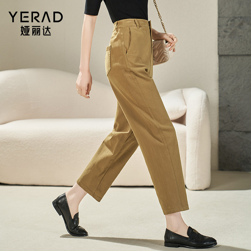 娅丽达秋季新款休闲镰刀裤女宽松工装裤舒适水洗棉驼色哈伦牛仔裤