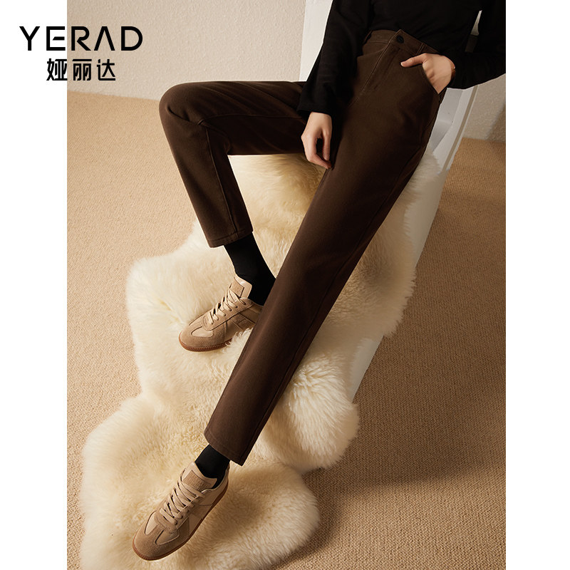 娅丽达加绒牛仔裤女咖色女裤老爹裤冬季新款白色裤子小个子哈伦裤