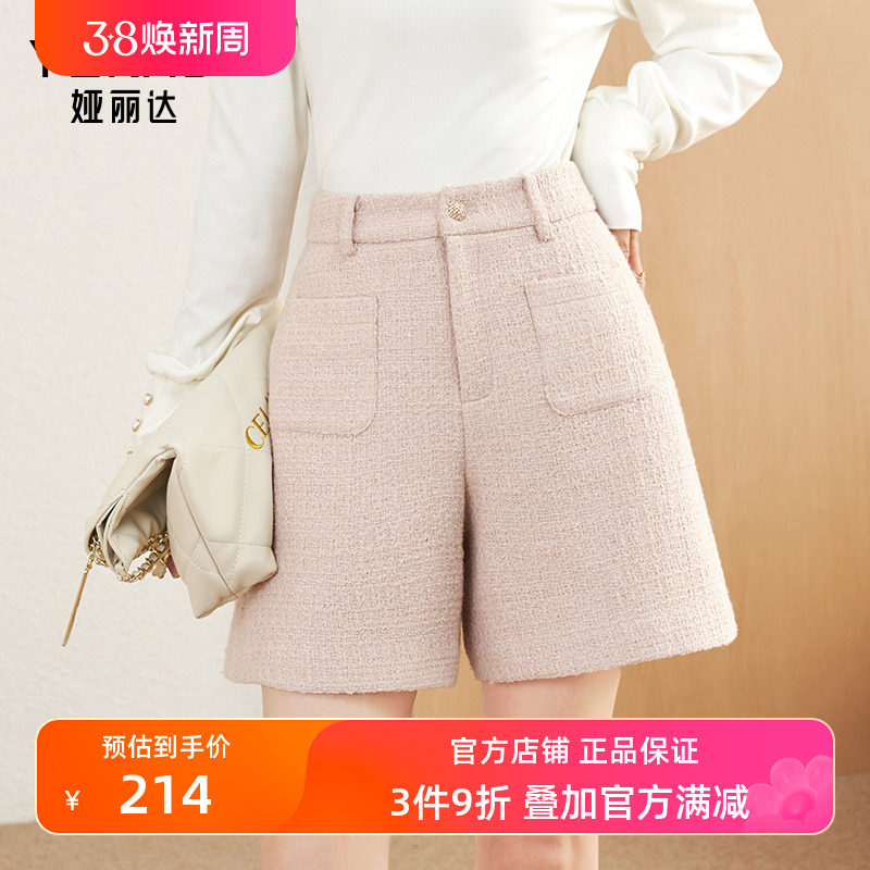 娅丽达小香风羊毛短裤女2023新款秋冬裤子粗花呢法式女裤阔腿靴裤