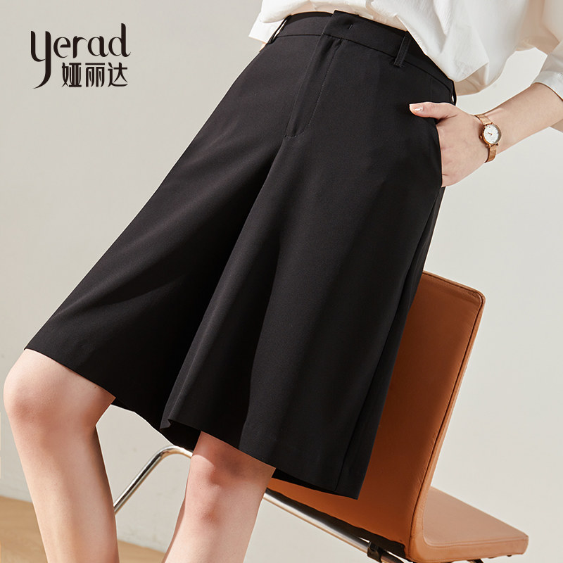 娅丽达女裤黑色西装短裤女阔腿裤2021夏季薄款裤子宽松直筒五分裤
