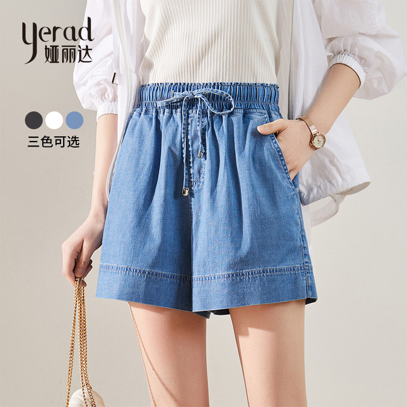 娅丽达女裤天丝牛仔短裤女夏a字白色裤子2022薄款松紧高腰阔腿裤