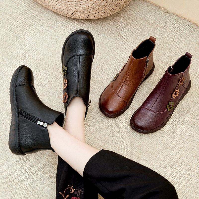 真皮短靴妈妈棉鞋羊毛软底单靴牛筋平底中老年女靴子冬季加绒皮鞋