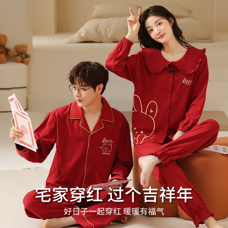 婷美纯棉结婚睡衣新婚情侣套装秋冬新款红色喜庆本命年家居服男女