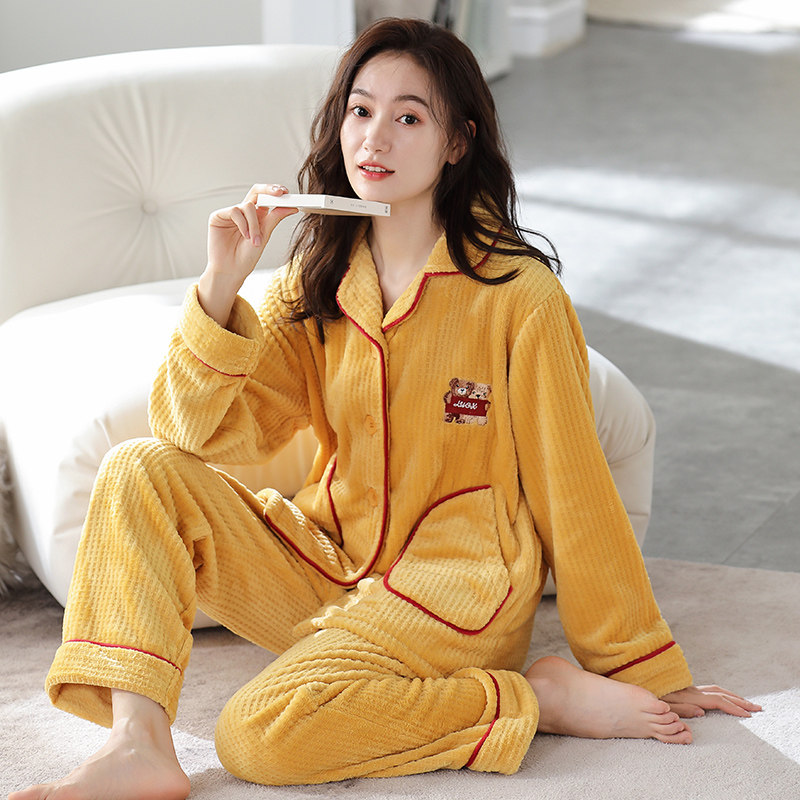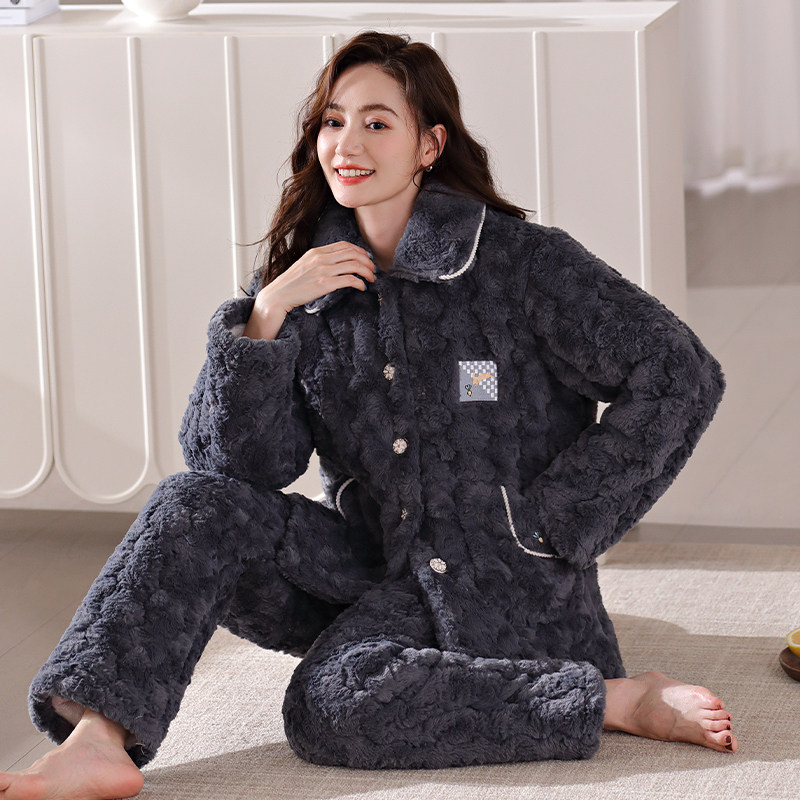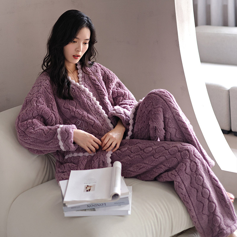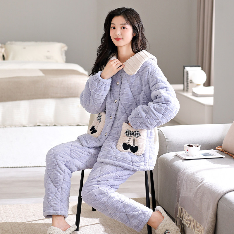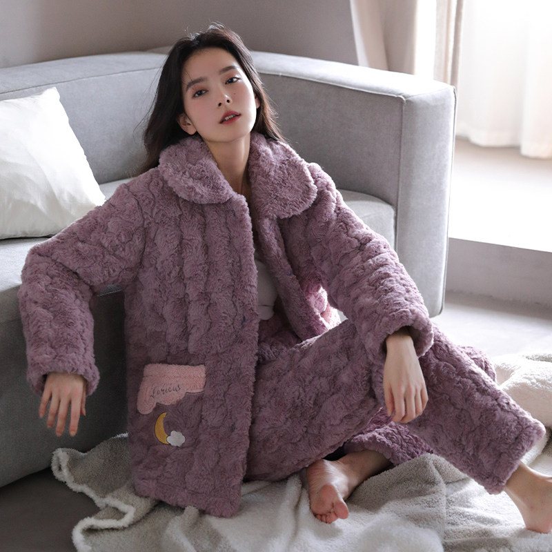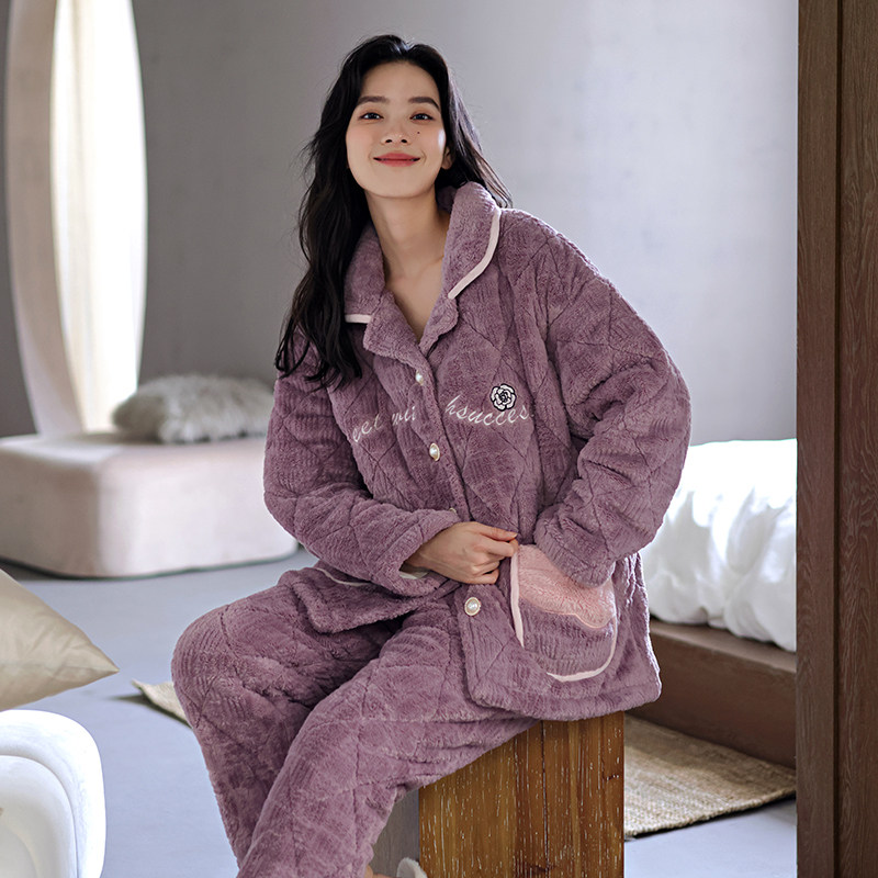 婷美珊瑚绒睡衣女士冬季开衫翻领三层夹棉加绒加厚甜美家居服套装