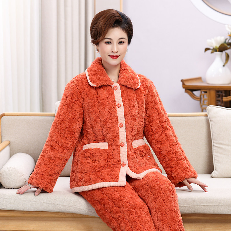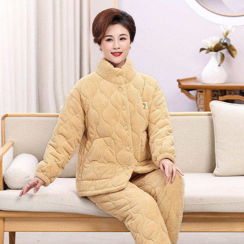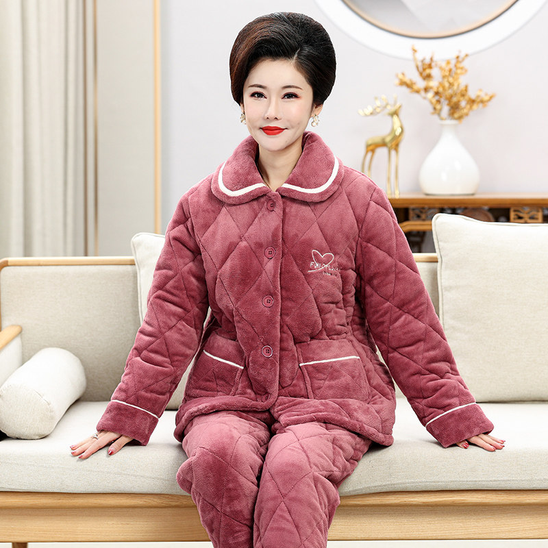婷美中老年睡衣女冬款珊瑚绒加厚加绒三层夹棉套装大码秋冬家居服