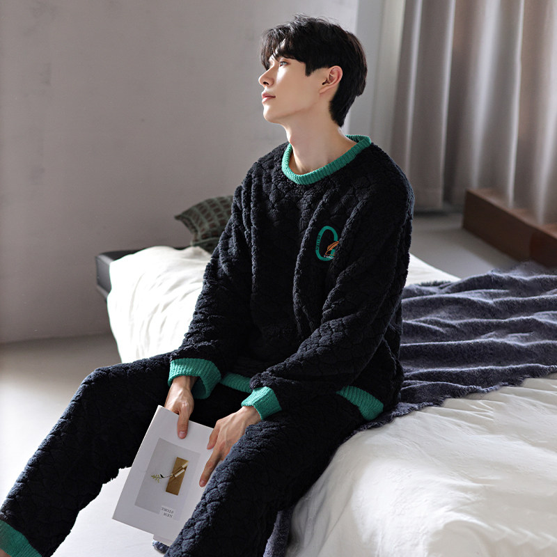 婷美冬季睡衣男保暖长毛绒套头圆领加绒加厚新款套装珊瑚绒家居服