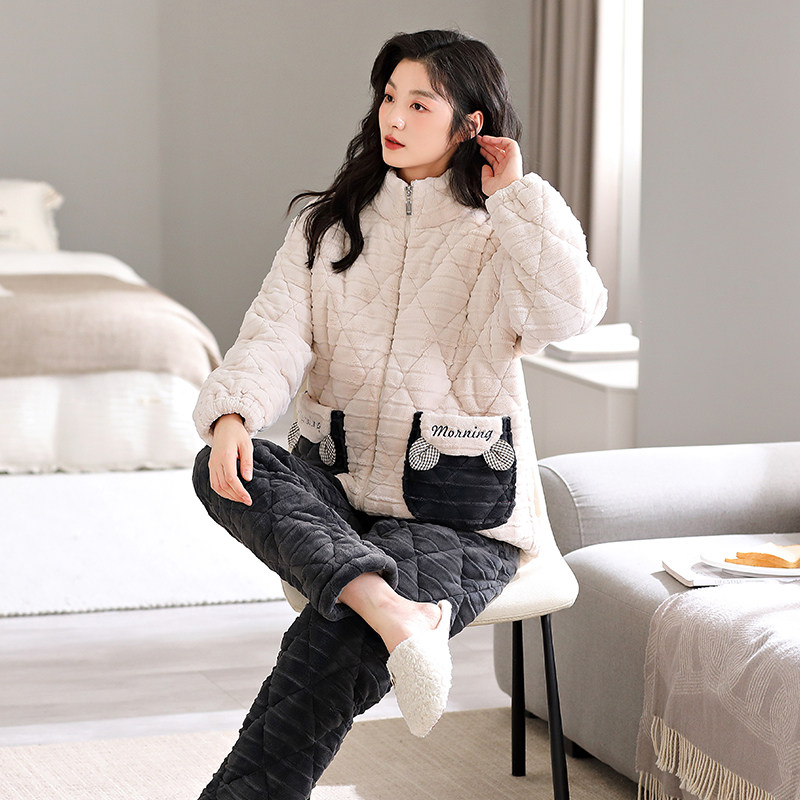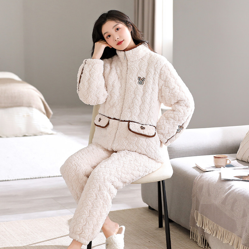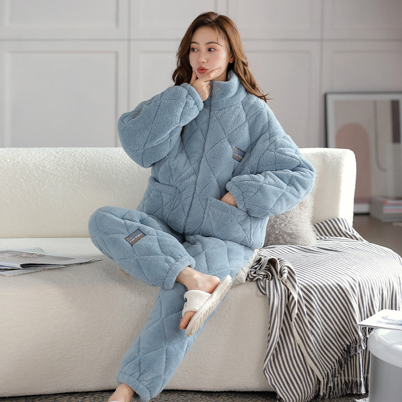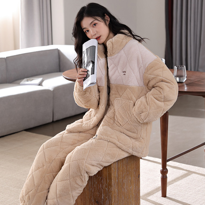 婷美珊瑚绒睡衣女秋冬款加绒加厚三层夹棉袄冬季可外穿家居服套装