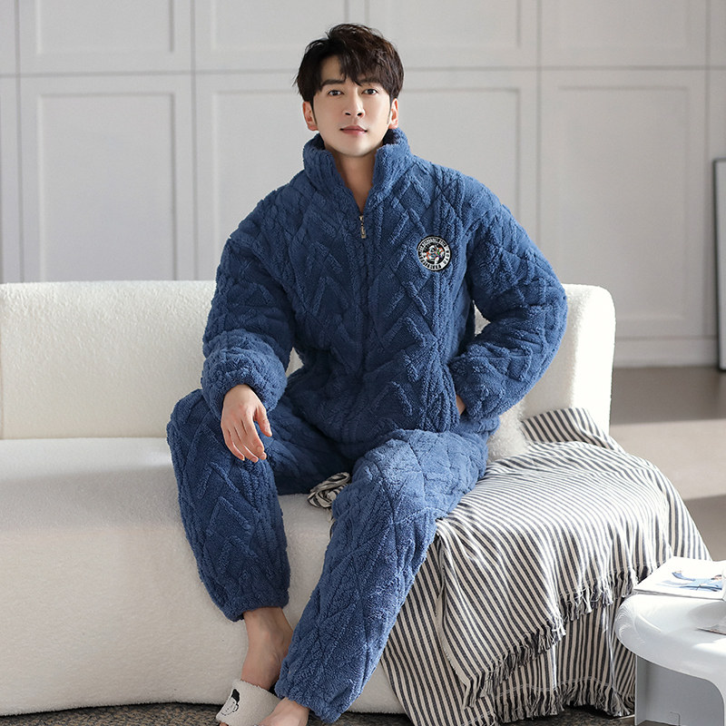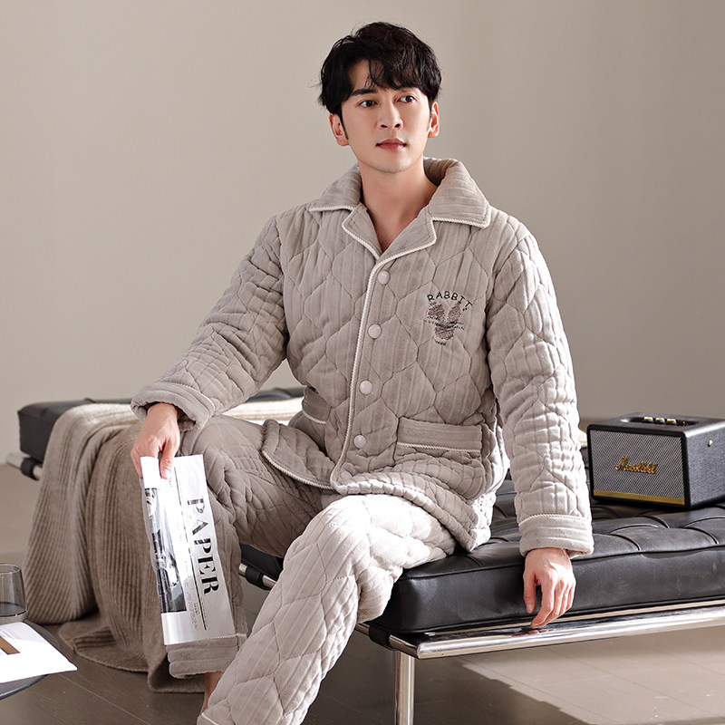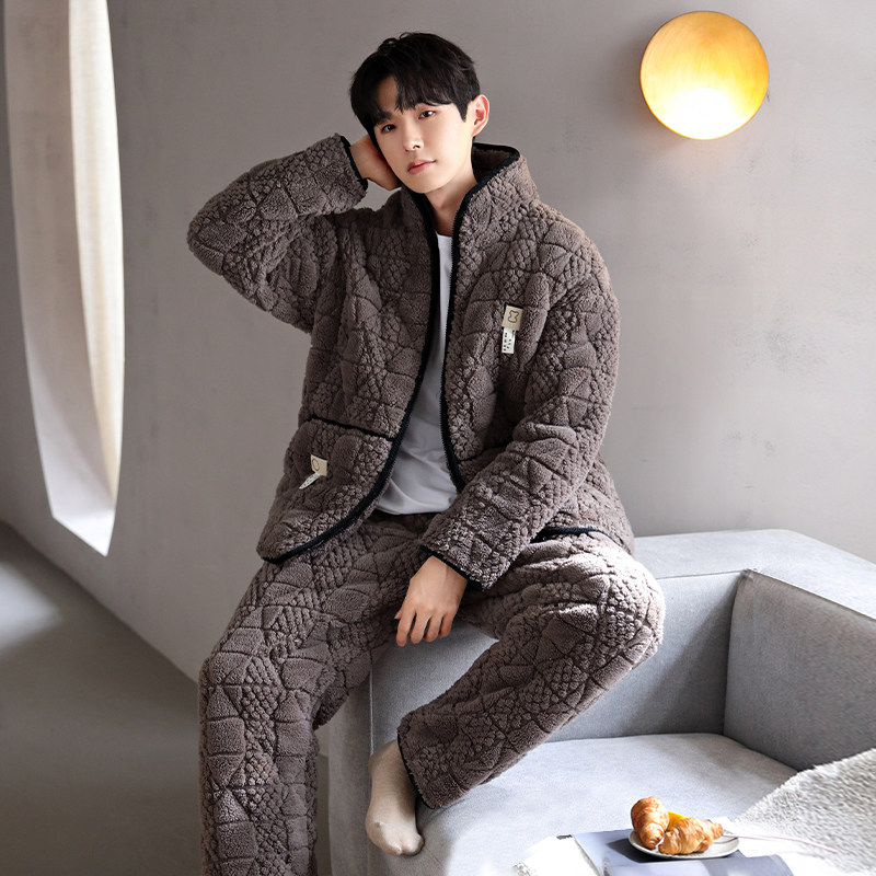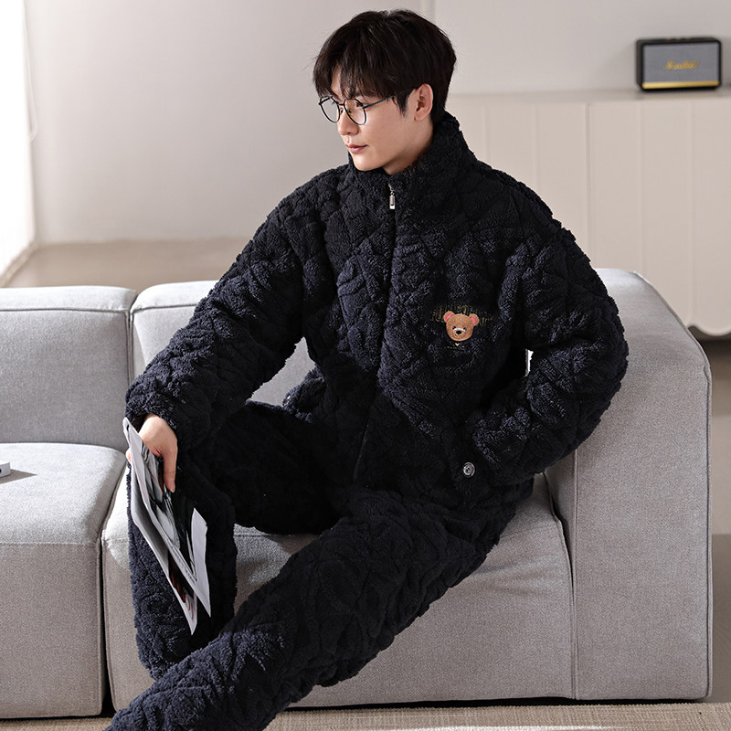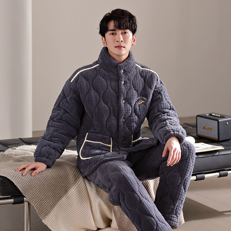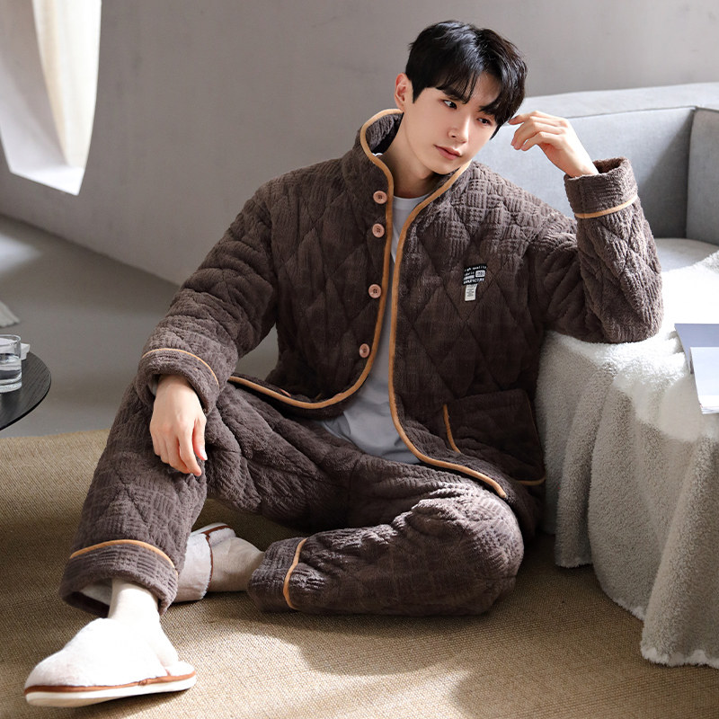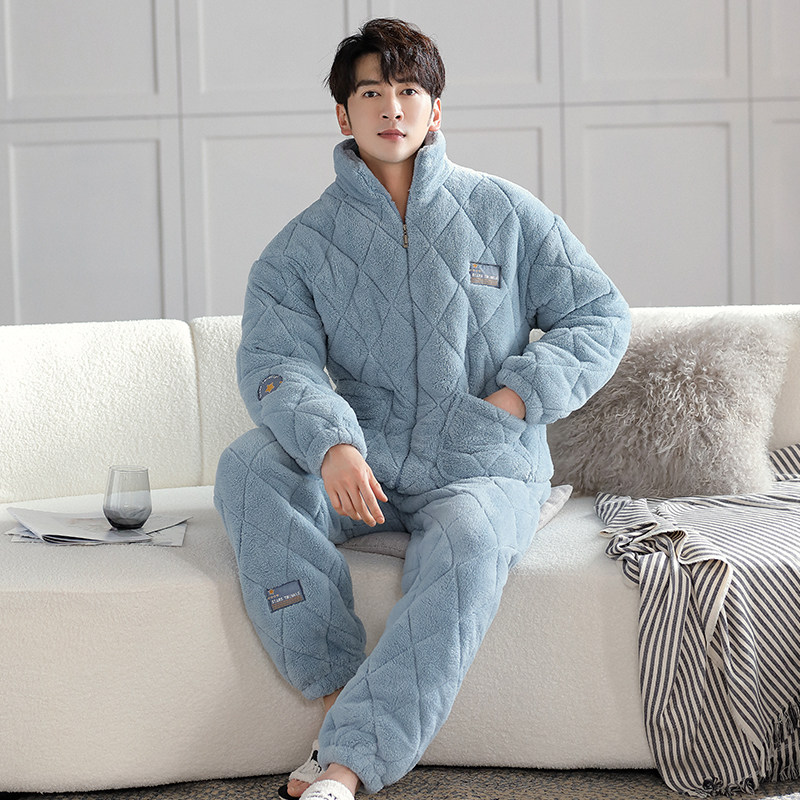 婷美珊瑚绒睡衣男士秋冬季三层保暖加绒加厚夹棉袄家居服