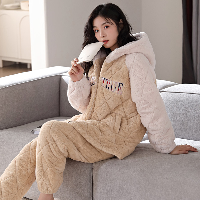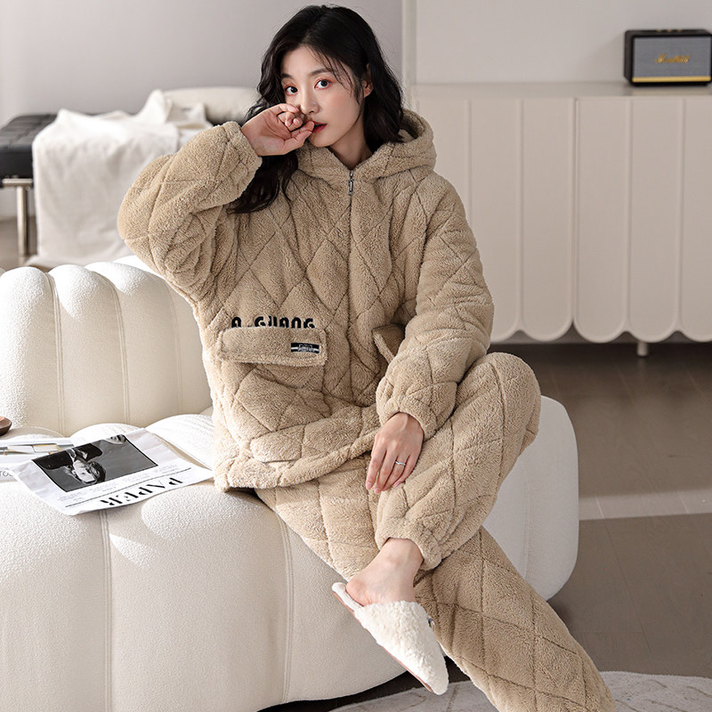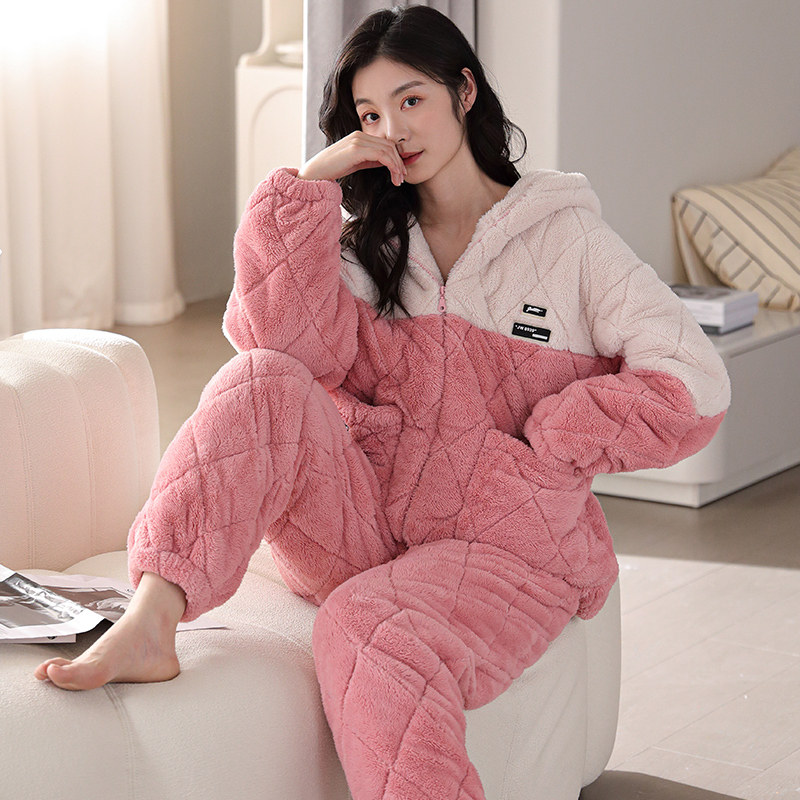 婷美连帽睡衣女士秋冬季加绒加厚珊瑚绒三层夹棉袄外穿家居服套装