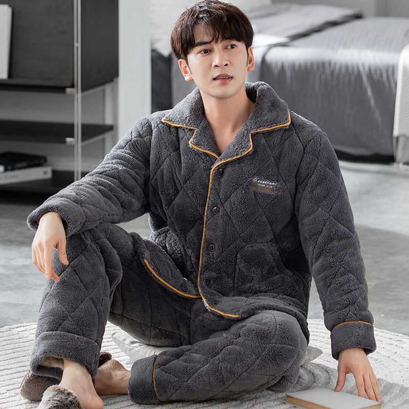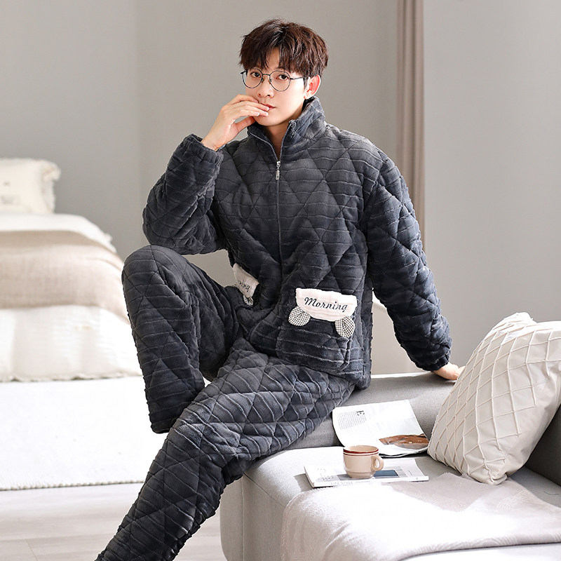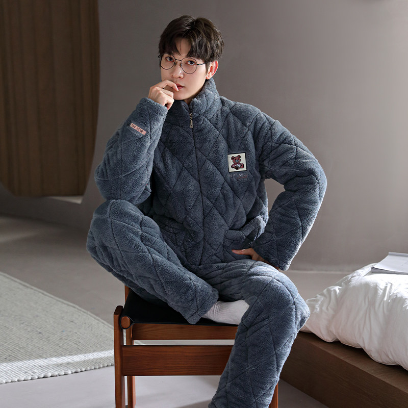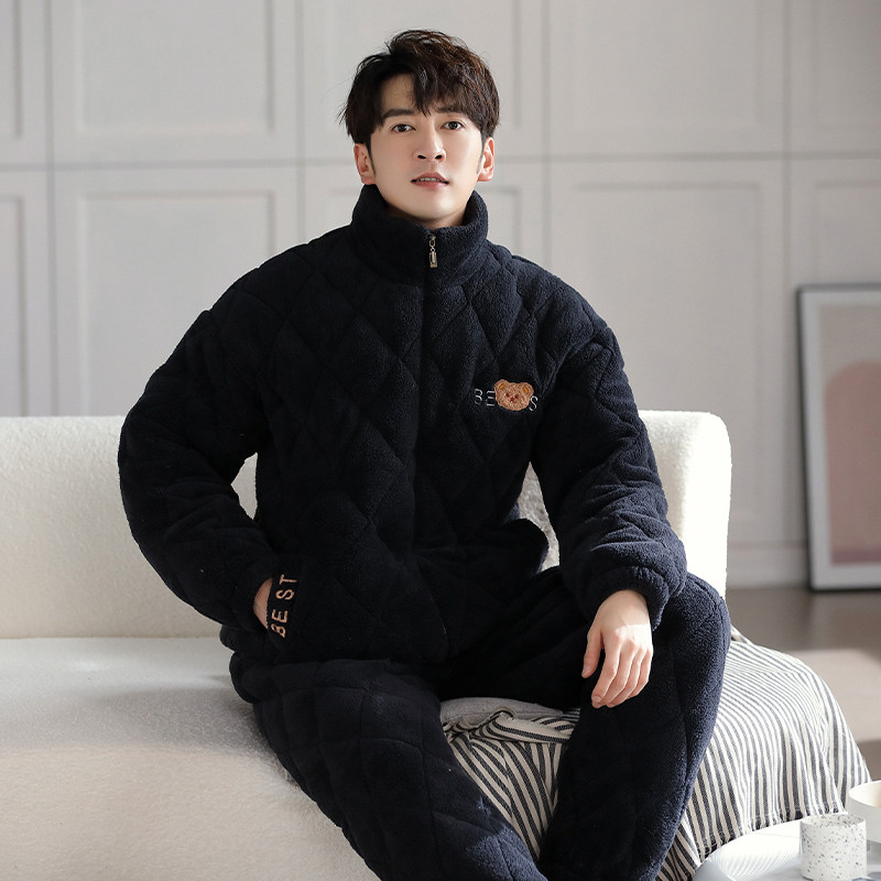 婷美男士睡衣冬季珊瑚绒三层加绒加厚夹棉秋冬天可外穿家居服套装