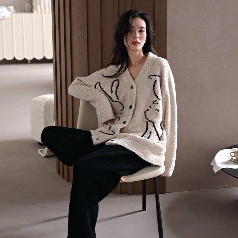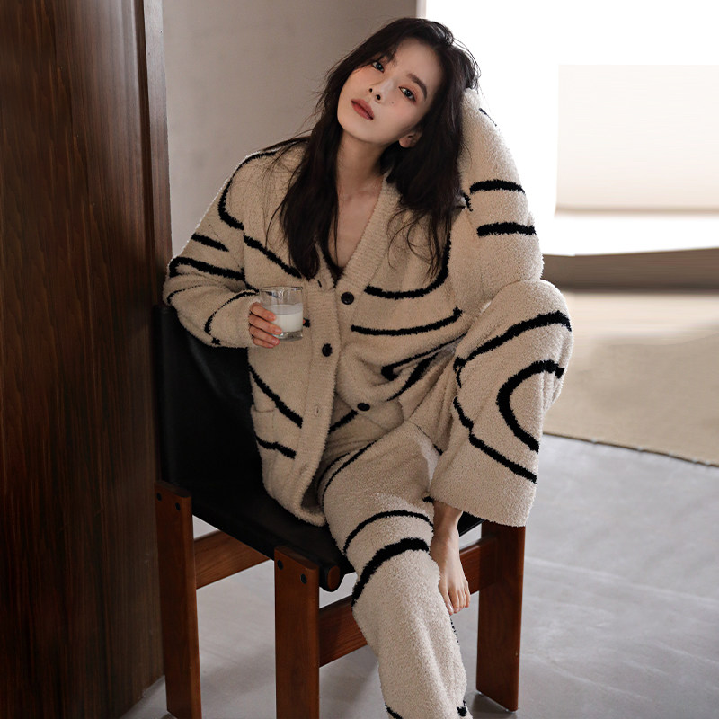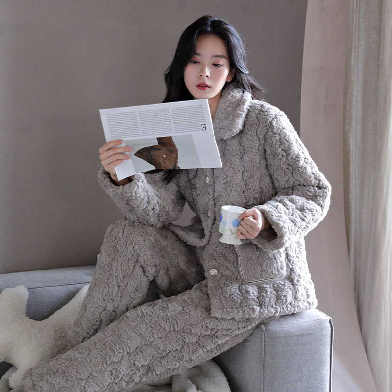 婷美珊瑚绒睡衣女冬季开衫休闲加绒新款家居服秋冬款半边绒两件套