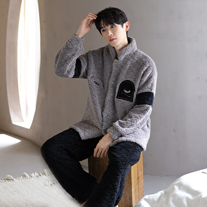 婷美保暖睡衣男冬季长毛绒开衫立领加绒加厚珊瑚绒家居服秋冬套装