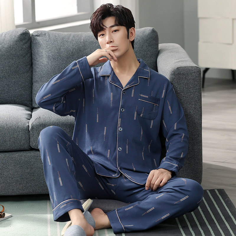 婷美纯棉睡衣男款春秋季长袖男士青年大码宽松休闲秋冬家居服套装