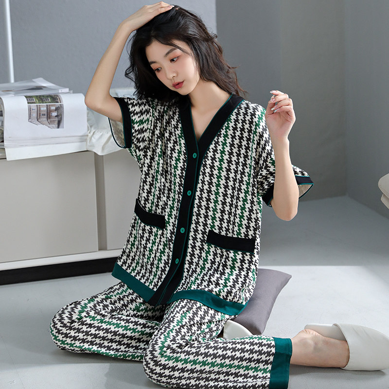 婷美夏天纯棉睡衣女薄款短袖长裤开衫可外穿夏季韩版居家服两件套