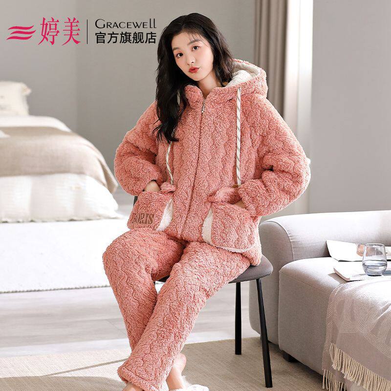 婷美三层夹棉连帽睡衣女士冬季珊瑚绒加绒加厚保暖家居服外穿套装