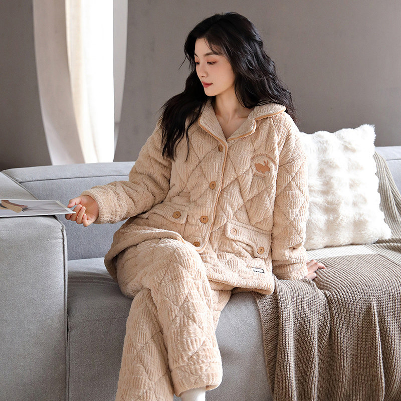 婷美珊瑚绒睡衣女冬季三层加绒加厚珊瑚绒夹棉袄家居服女冬款套装