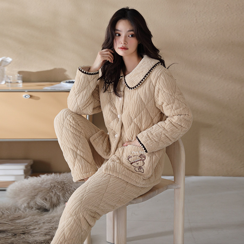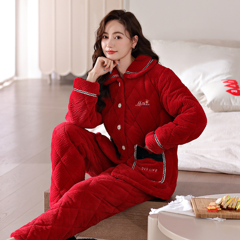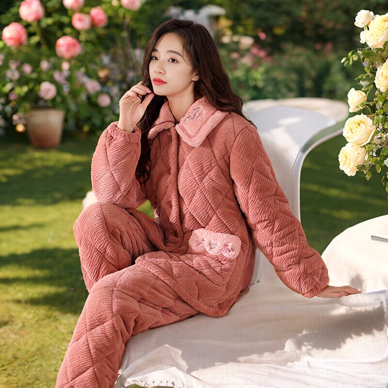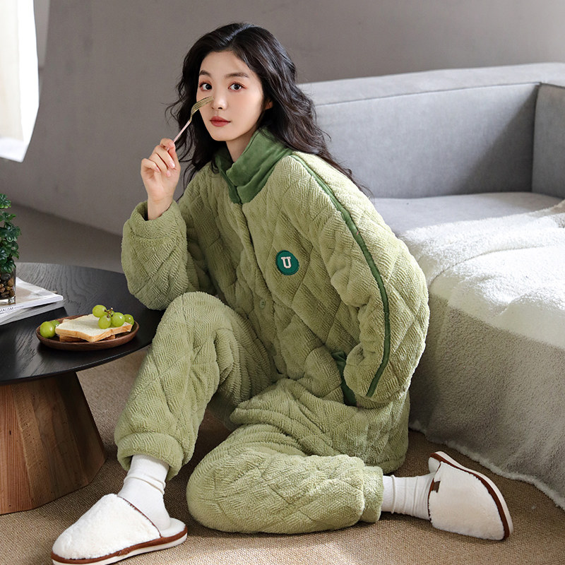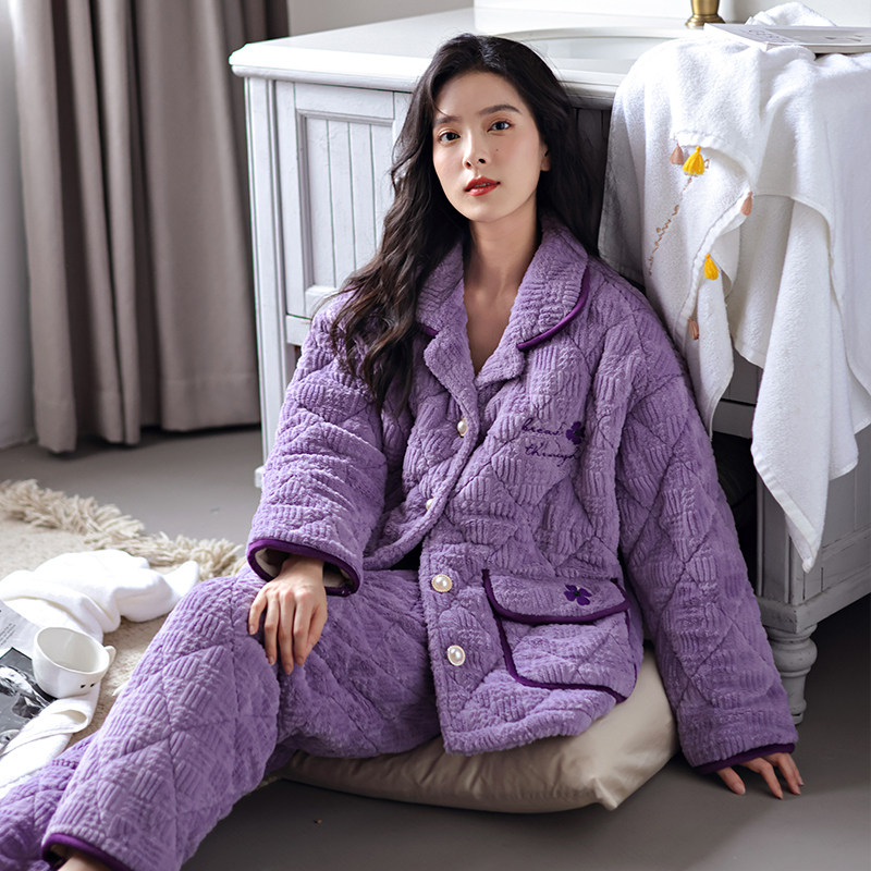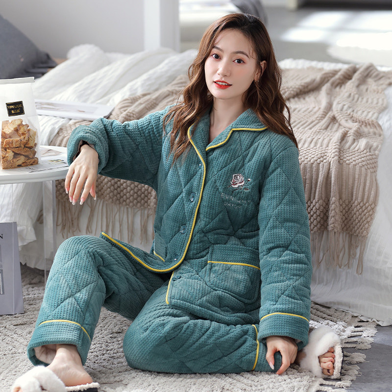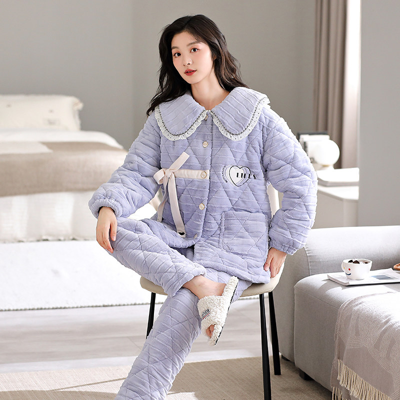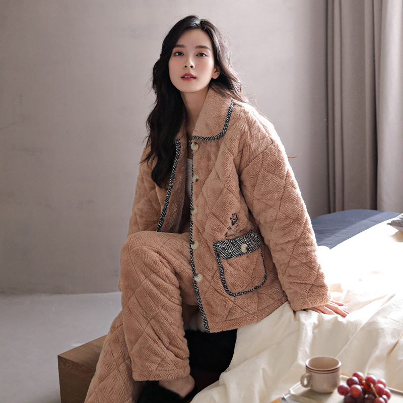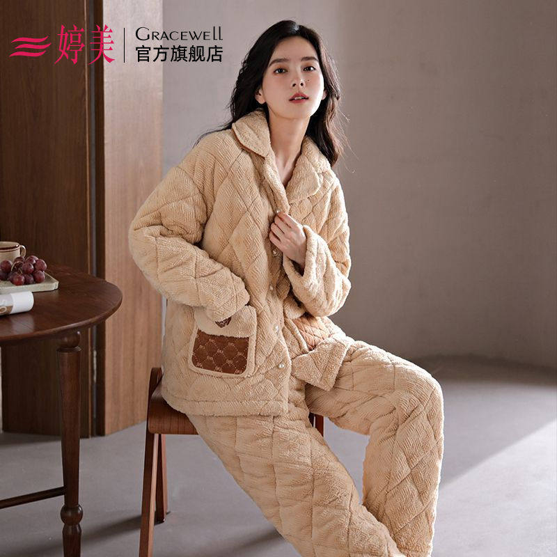 婷美夹棉袄睡衣女士冬季三层保暖加绒加厚珊瑚绒秋冬天家居服套装